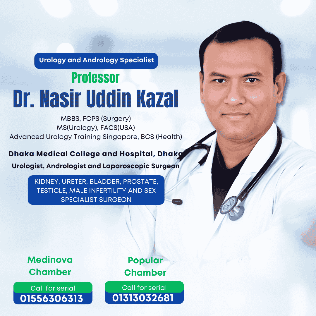 আমি Professor Dr. Nasir Uddin Kazal, Dhaka Medical College-এর Professor এবং একজন অভিজ্ঞ Urologist ও Andrologist। আমার পেশাগত জীবন কেটেছে রোগীদের মূত্রনালী, কিডনি, প্রোস্টেট এবং পুরুষদের প্রজনন স্বাস্থ্য সম্পর্কিত সমস্যা চিহ্নিত ও চিকিৎসা করার কাজে।